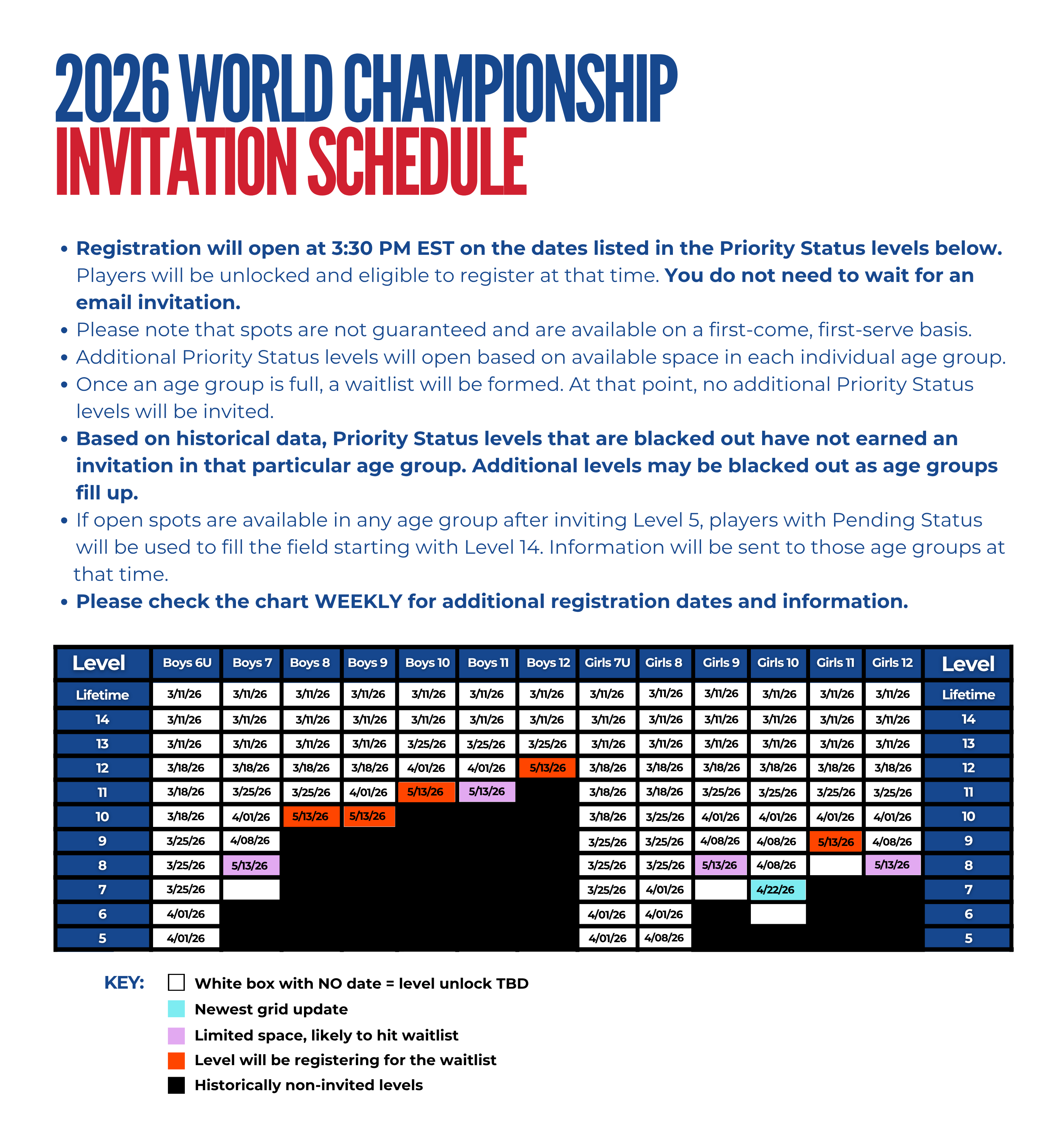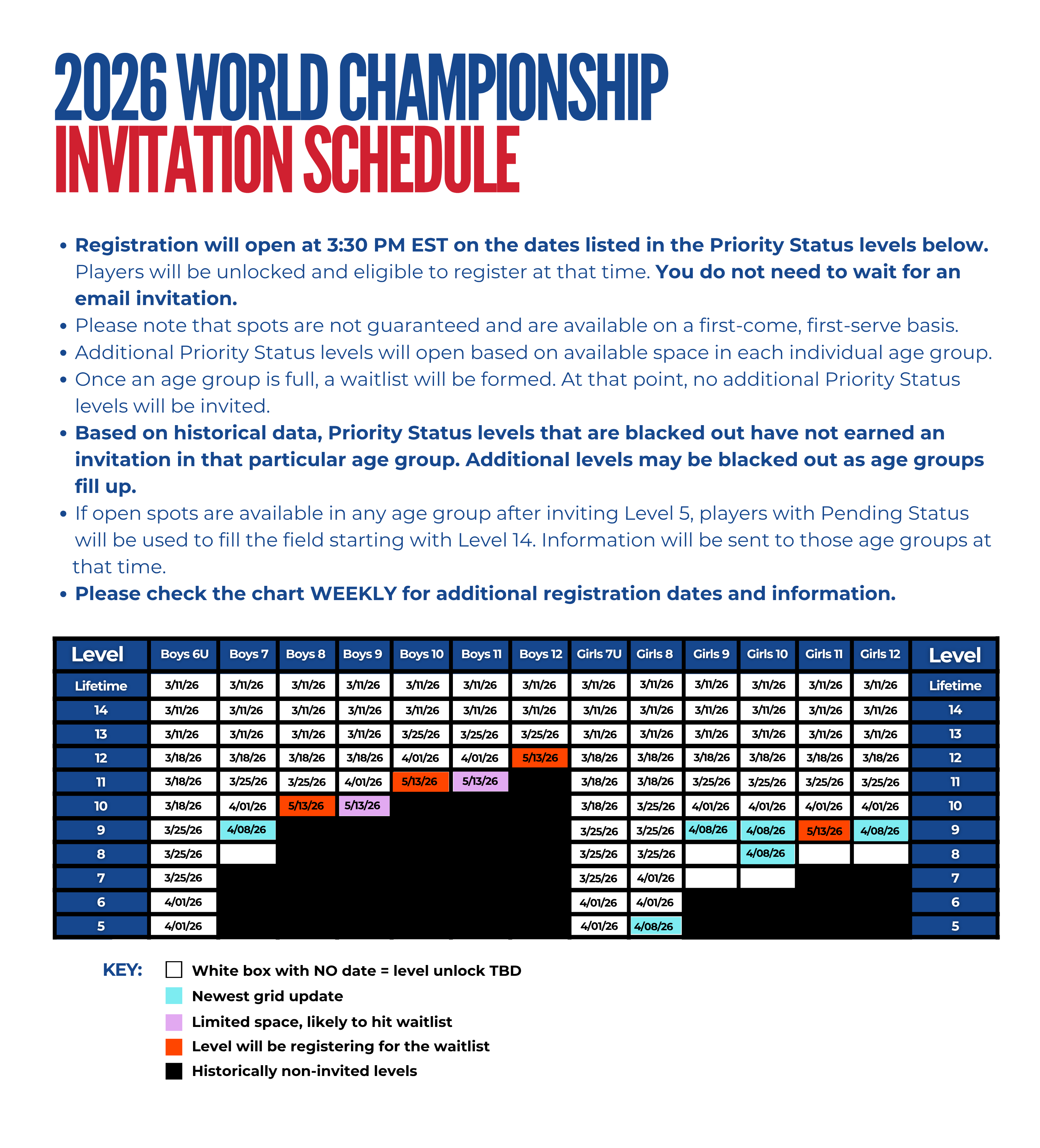 Exemptions for siblings will be extremely limited and only available in age groups that do not fill up or do not have a waiting list. Players who request a sibling exemption for the World Championship, and meet the exemption requirements, will be placed on a sibling exemption waiting list. We will begin reviewing the sibling waitlist starting June 20th. Upon review, qualified siblings will only be accepted on a space-available basis and by Priority Status Level. Age Groups with significant demand will not be eligible for Sibling Exemptions.